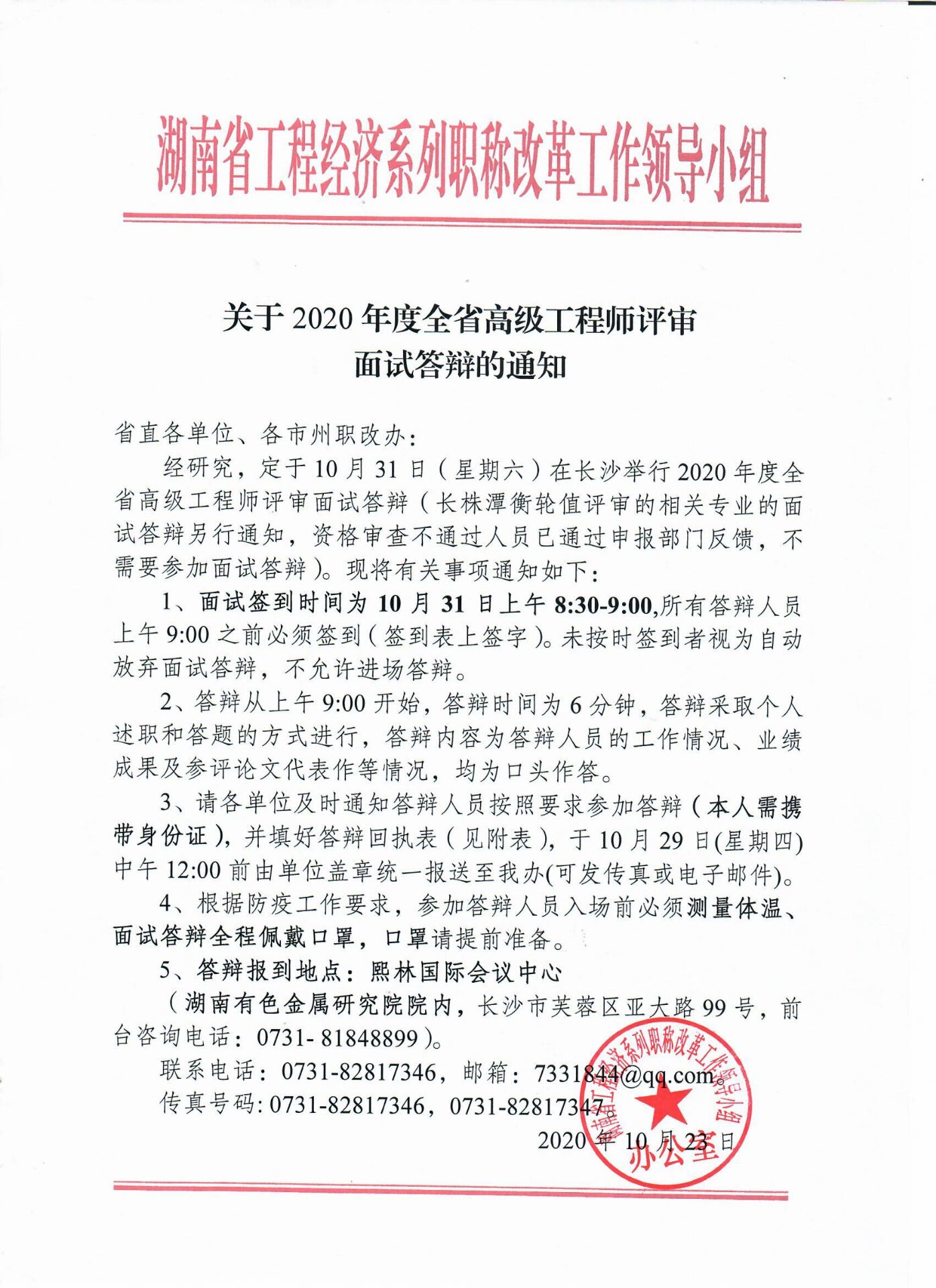 更新日期:2020-10-23根据湖南省工程经济系列职改办《关于2020年度全省高级工程师评审面试答辩的通知》文件精神(附件1),现就有关事项通知如下:
